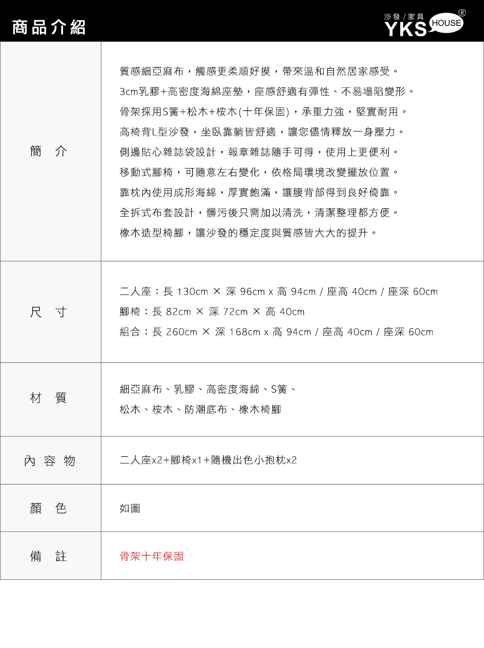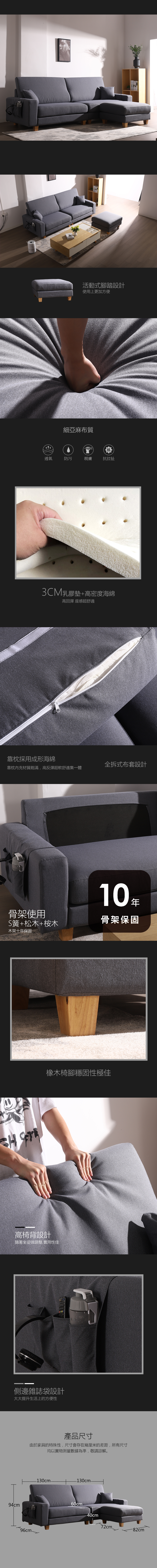 細亞麻布觸感柔順溫和,S簧+松木+桉木骨架,堅實耐用,乳膠+高密度海綿座墊,高椅背L型沙發,坐臥靠躺更舒適