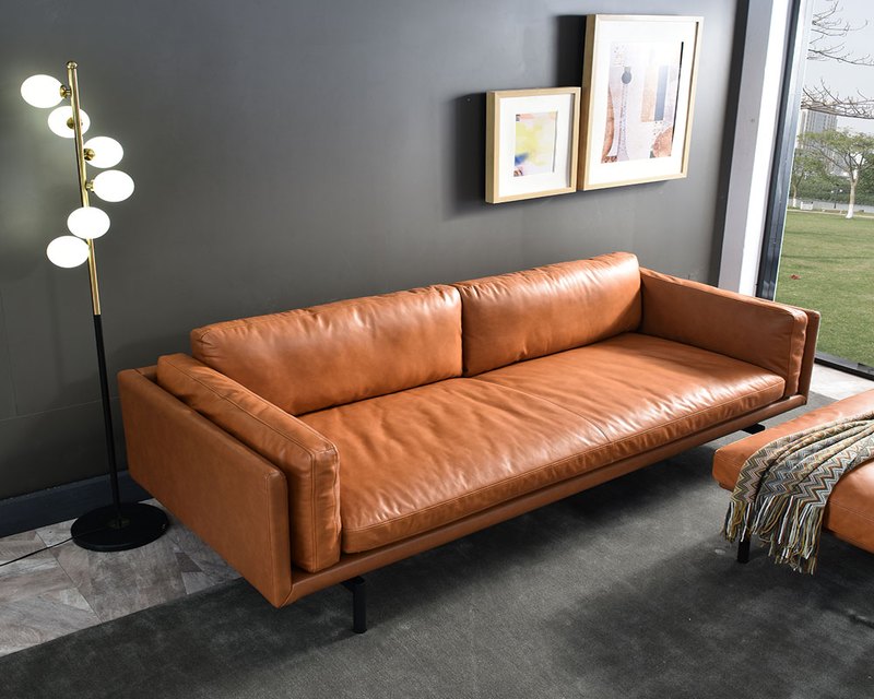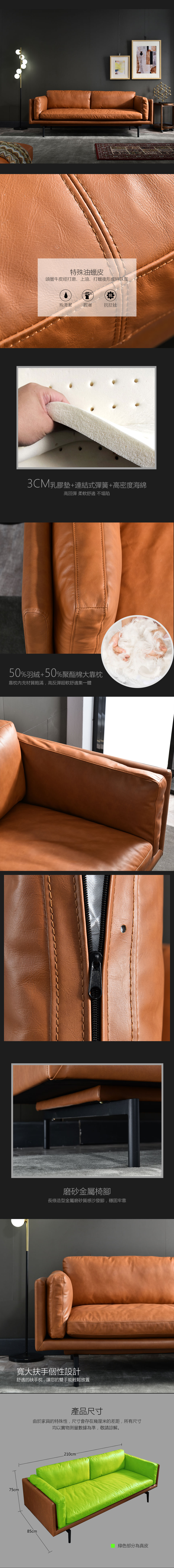 牛皮等級:半苯染,頭層牛皮經由高級製皮工藝,打造出油蠟皮的特殊皮感效果,乳膠加獨立筒座墊,羽絨加聚酯棉大靠枕,彈性適中、坐感超舒適